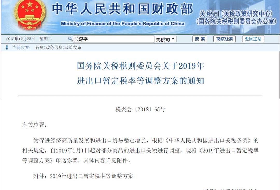 12月24日,財政部發布通知,自2019年1月1日起調整部分商品進出口關稅。取消新能源汽車鋰離子電池進口暫定稅率,恢復執行最惠國待遇稅率。為了積極擴大進口,降低進口環節的制度成本,幫助供給側結構性改革,中國將對700多種商品實施進口暫定稅率,包括對雜餐和部分藥品生產原材料加征零關稅,適當降低棉花和部分毛皮的臨時進口稅率,取消錳渣等四種固體廢物的臨時進口關稅稅率,取消新能源汽車用氯化亞砜和鋰離子電池的臨時進口稅稅率,恢復最惠國待遇稅率。對國內發展急需的航空發動機、汽車生產線焊接機器人、天然飼料、天然鈾等先進設備,繼續降低進口暫定稅率。