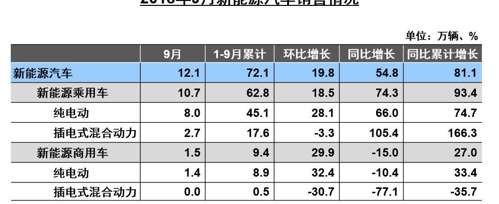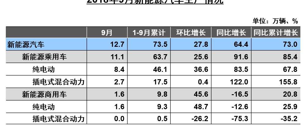 1-9月,新能源汽車累計產銷分別為73.5萬輛和72.1萬輛,分別比去年增長73%和81.1%。其中,純電動汽車產銷分別為55.5萬輛和54.1萬輛,分別增長58.9%和66.2%。混合動力汽車產銷分別為18萬輛和18.1萬輛,分別比去年同期增長138%和146.9%。