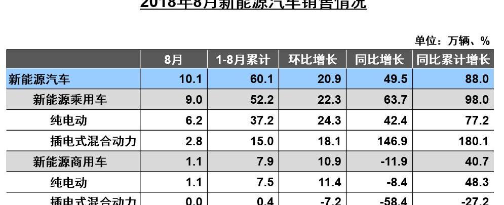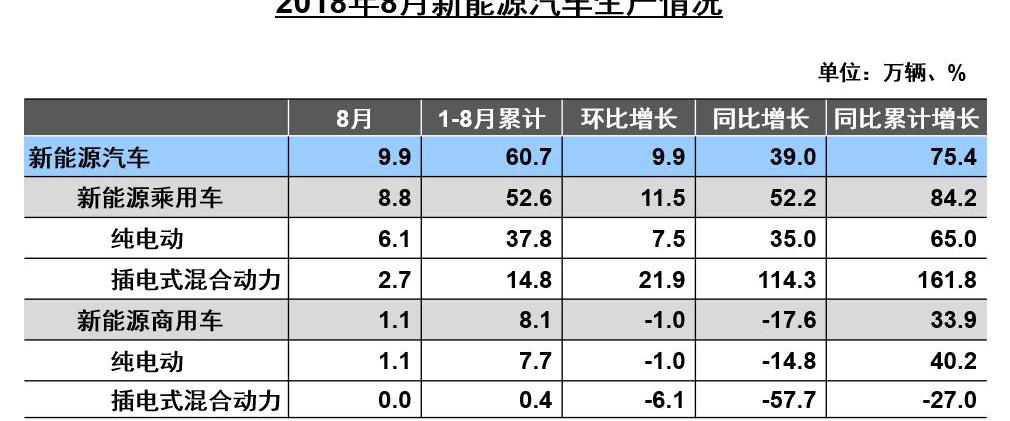 9月11日,中國汽車協會發布了2018年8月汽車產銷數據。在新能源汽車板塊,8月產銷分別為9.9萬輛和10.1萬輛,同比增長分別為39%和49.5%。通過分析8月新能源汽車產量,新能源乘用車產量為8.8萬輛,其中純電動乘用車6.1萬輛,插電式混合動力乘用車2.7萬輛。新能源商用車產量1.1萬輛,其中純電動商用車1.1萬輛、插電式混合動力商用車0輛。
