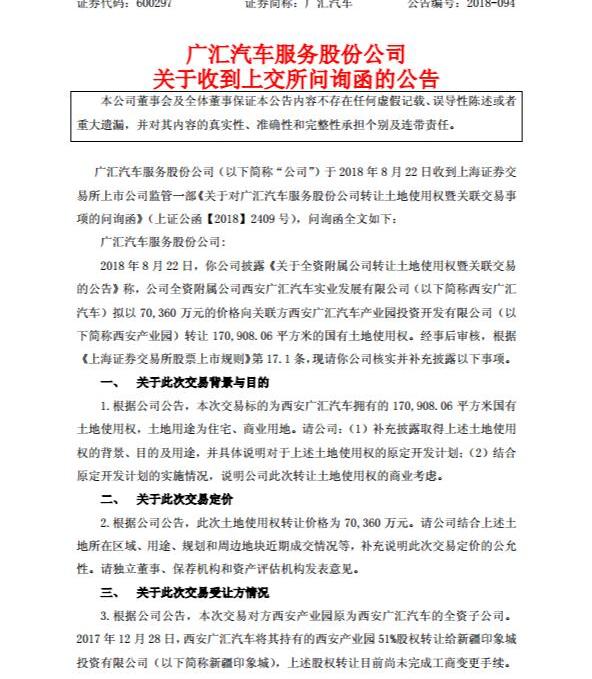 今天,有限公司(以下簡稱中廣汽車)宣布,已收到上海證券交易所《中廣汽車土地使用權轉讓及關聯交易查詢函》,要求中廣汽車在2018年8月27日前核實并補充相關信息。