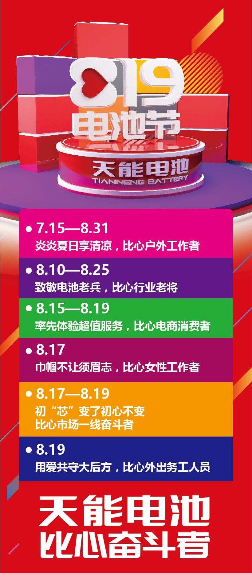 為行業健康發展貢獻力量,為美好生活繼續奮斗2018年8月10日,天能正式宣布將每年的8月19日定為電池節!從那以后,炮手有了自己的節日。