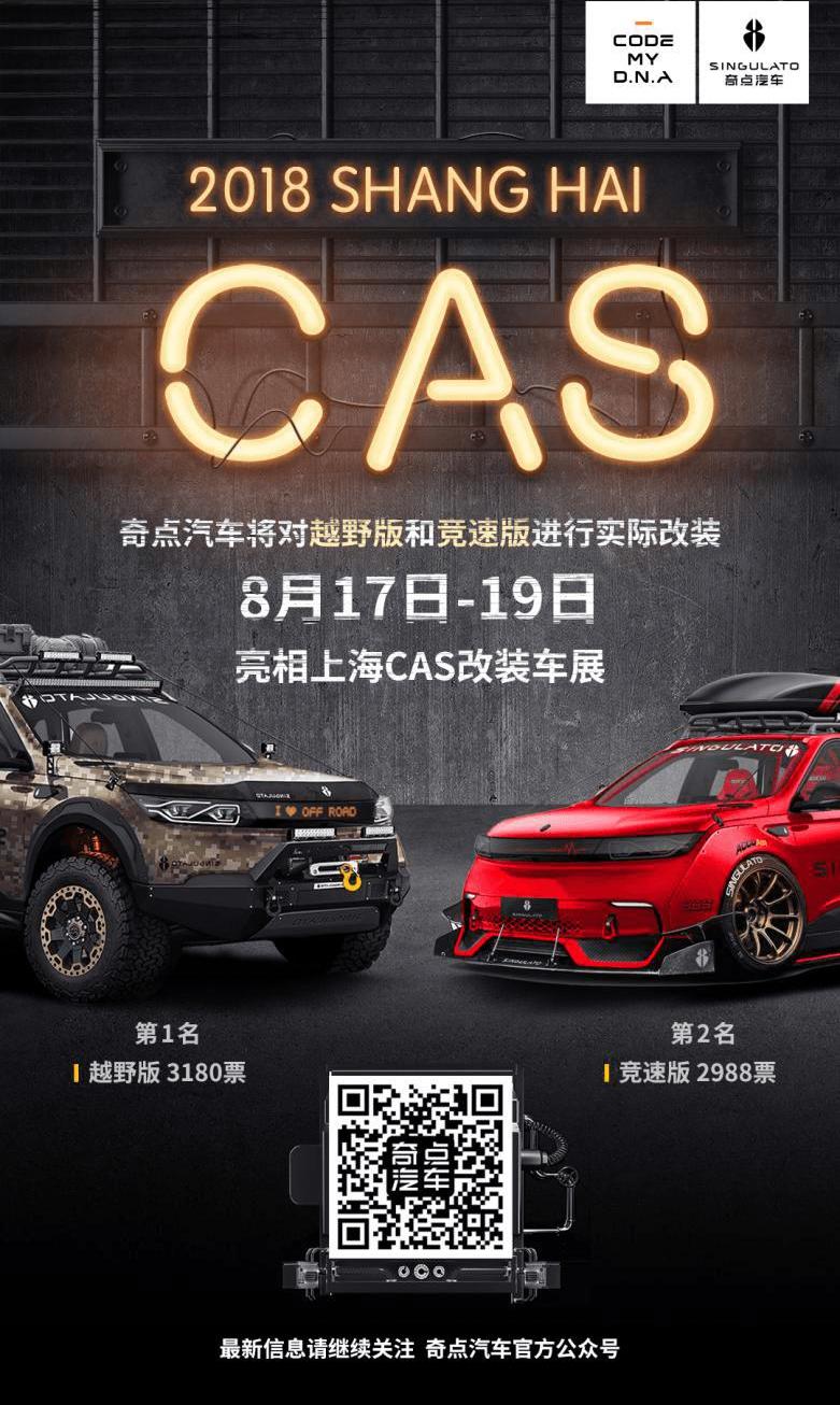 2018年8月17日至19日,第八屆CAS改裝車展在上海國家會展中心舉行。被譽為“中國首個改裝展”的此次改裝愛好者盛會,在奇點汽車等新能源汽車品牌的參與下,也注入了鮮明的互聯網開放精神。在CAS改裝展上,奇點汽車宣布了以用戶參與為核心的“CODE MY D.N.A-奇點重組計劃”,并展示了用戶定制的第一階段成果——奇點iS6 Pro(賽車版和越野版);下一階段“奇異原因重組計劃”將全面開放奇異iS6智能應用&;