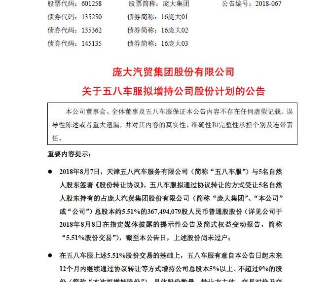 8月7日,巨人集團宣布,為引進戰略投資者,完善公司治理,李少艷、郭文毅、裴文輝、楊嘉慶、李莫輝等五位自然人股東以協議方式將其持有的367494079股股份轉讓給天津五霸汽車服務有限公司,占公司總股本的5.51%。自2011年龐大集團上市以來,其盈利能力一直不佳。2012年至2017年,只有2016年扣除非經常性損益后的凈利潤為正。今年第一季度,龐大集團的業績持續下滑。報告期內,公司營業收入141.23億,同比下降10.71%,凈利潤4579.73萬,同比下降60.82%。除了在一定程度上解決龐大集團的資金問題,58汽車的加入,同時,業內分析人士表示,憑借58集團在汽車業務方面的優勢,未來58集團的線上業務和1000多家線下4S店有望開業,新零售將深入布局。昨晚,巨人集團宣布,天津五霸汽車服務有限公司有限公司打算通過協議轉讓該公司約5.51%的股份。截至本公告發布之日,上述股份尚未轉讓。在五八汽車服務上述5.51%股份交易的基礎上,五八汽車服擬自本公告發布之日起未來12個月內繼續增持公司總股本的5%以上但不超過9%。該控股計劃不會引發要約收購,也不會導致公司控制權的變化。