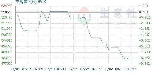 根據對商業數據的監測,上周鈷的價格出現波動,下跌了2.16%。截至8月12日,市場鈷的平均價格為483333.34元/噸,與上周末相比為494000.00元/噸。鈷價格下跌10666.66元/噸,跌幅2.16%,較去年同期上漲17.22%。一、價格走勢