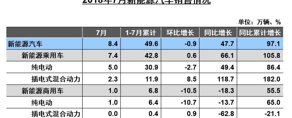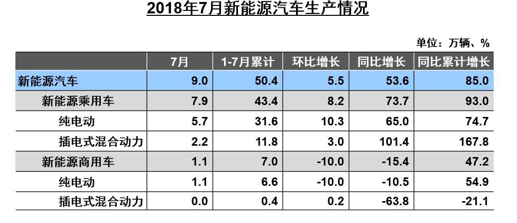 1-7月,新能源汽車累計產銷分別為50.4萬輛和49.6萬輛,分別比去年增長85%和97.1%。其中,純電動汽車產銷分別為38.2萬輛和37.3萬輛,分別增長71%和82.4%。混合動力汽車產銷分別為12.2萬輛和12.3萬輛,與去年同期相比分別增長148.9%和160.9%。8月10日,中國汽車協會發布了2018年7月汽車產銷數據。新能源汽車板塊,7月產銷分別為9萬輛和8.4萬輛,同比分別增長53.6%和47.7%。通過分析7月新能源汽車產量,新能源乘用車產量為7.9萬輛,其中純電動乘用車5.7萬輛,插電式混合動力乘用車2.2萬輛。新能源商用車產量1.1萬輛,其中純電動商用車1.1萬輛、插電式混合動力商用車0輛。