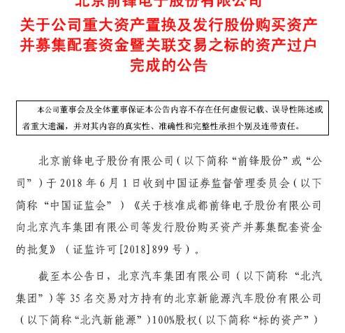 根據證監會此前批準的計劃,SST前鋒將其所有資產和負債存放在北汽集團,并發行股份購買北汽新能源100%股權,并籌集配套資金20億元。其中,北汽新能源向SST前鋒注資288.5億元,SST前鋒的所有資產和負債定為1.87億元。抵消286.69億元后,SST前鋒以37.66元/股的發行價格向北汽集團等35家交易對手發行7.61億股。