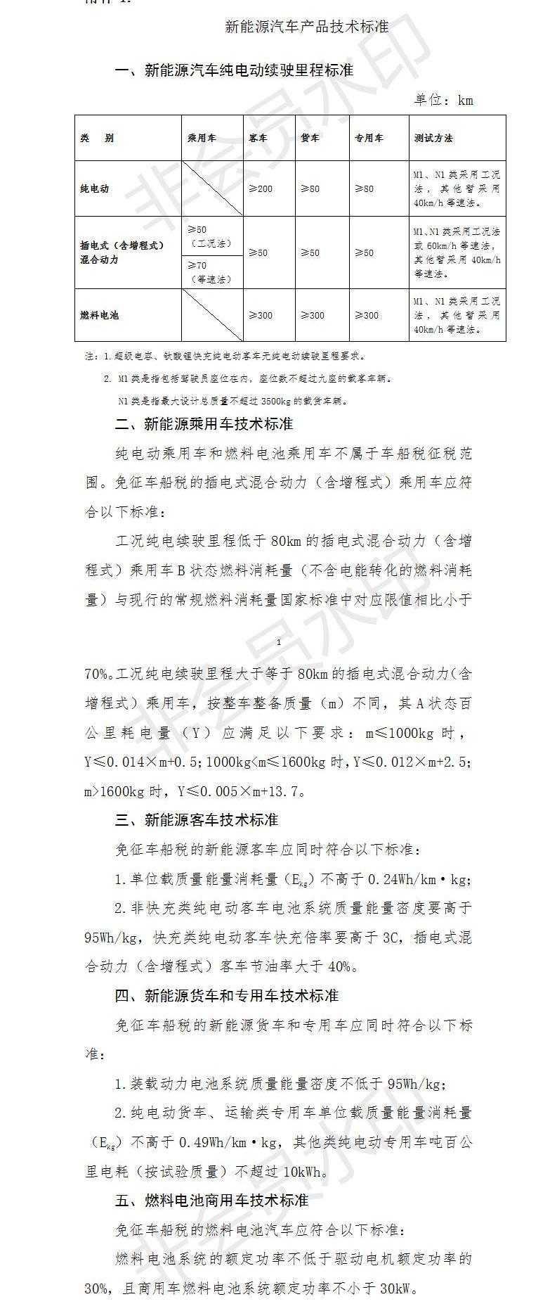 2.綜合工況下的油耗應符合標準。具體要求見附件1。(2) 車船稅減半征收的節能型商用車,應當同時符合下列標準:1。在中國許可銷售的燃燒天然氣、汽油和柴油的輕型和重型商用車(包括非插塞式混合動力、雙燃料和雙燃料輕型和重型商業車);2.輕型和重型商用車在綜合工況下燃用汽油和柴油的油耗應符合標準。具體標準見附件2和附件3。二是新能源汽車,免征旅行稅。(1) 免征旅行稅的新能源汽車是指純電動商用車、插電式(含增程)混合動力汽車和燃料電池商用車。純電動乘用車和燃料電池乘用車不屬于旅行稅的征收范圍,不征收旅行稅。(2) 免征旅行稅的新能源汽車應同時符合以下標準:1。在中國獲得銷售許可的純電動商用車、插電式(包括增程)混合動力車和燃料電池商用車;2.符合新能源汽車產品技術標準,具體標準見附件4;3通過新能源汽車專項檢驗,符合新能源汽車標準,具體標準見附件5;4.進口新能源汽車的新能源汽車制造商或經銷商在產品質量保證、產品一致性、售后服務、安全監測和動力電池回收等方面符合相關要求。具體要求見附件6。(3) 免征差旅費的新能源船舶應當符合下列標準:船舶的主要推進動力裝置為純天然氣發動機。如果發動機由微量柴油點燃,并且引燃燃料的熱值不超過所有燃料總熱值的5%,則視為純天然氣發動機。三、符合上述節能和新能源汽車標準的,由工業和信息化部、國家稅務總局不定期聯合發布《享受節能和新能量汽車旅行稅優惠目錄》(以下簡稱《目錄》)予以公布。四汽車生產企業或進口汽車經銷商(以下簡稱汽車企業)可通過工業部《節能與新能源汽車稅收優惠目錄》申報管理系統自愿報送節能汽車報告和新能源汽車報告(樣本報告見附件7和附件8)信息技術,并申請將其產品列入《目錄》,并對申報材料的真實性負責。工信部、國家稅務總局委托工信部裝備產業發展中心負責組織《目錄》的申報、宣傳培訓、具體技術審查和監督檢查。工業和信息化部裝備產業發展中心的評審結果將在工業和信息化部將在5個工作日內公布在工業和信息技術部網站上。如無異議,將列入《目錄》予以公布。如果產品不符合申報材料、產品性能指標不符合標準或汽車企業提供其他虛假信息,以及列入《目錄》后12個月內無產量或進口的車型,將在工業和信息化部網站上公示5個工作日,如果沒有異議,將從《目錄》中予以撤銷。五、船舶檢驗機構在經批準的船舶主推進動力裝置檢驗中,要符合本通知的新能源船舶標準,在其船用產品合格證上標明“純天然氣發動機”領域;