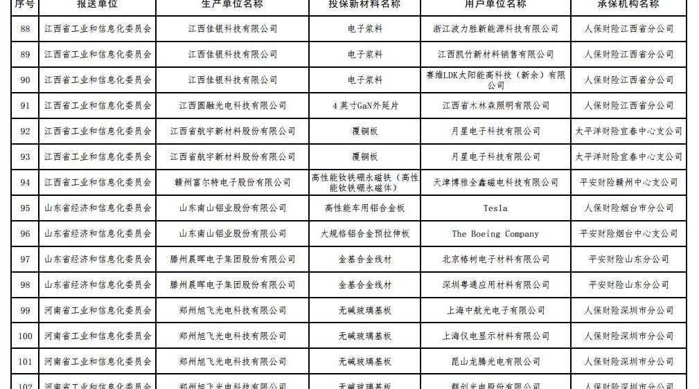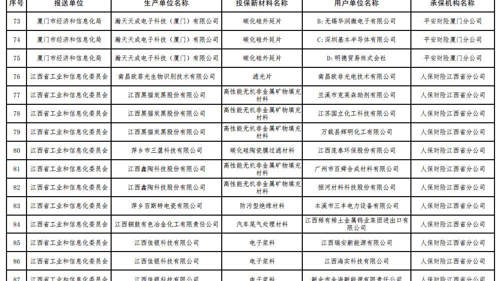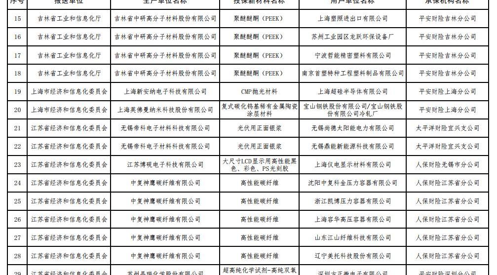 6 7月17日,工信部根據《工信部通知》公布了2017年第一批重點新材料保險補償機制試點工作擬補貼項目,財政部、中國保監會《關于啟動第一批重點新材料保險補償機制試點工作的通知》(工信部聯原〔2017〕222號)。投保的新材料涉及鎳鈷錳酸鋰三元材料、碳纖維復合芯導體、,高性能鋰電池隔膜、電子粘合劑硅樹脂材料、負極材料、電子漿料、高純度結晶六氟磷酸鋰、碳化硅外延片、高性能碳纖維等,共有244家提交生產單位。以下是2017年首批重點新材料保險賠付試點工作擬補貼項目名單: