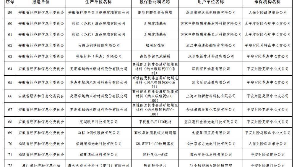 7月17日,工信部根據《工信部通知》公布了2017年第一批重點新材料保險補償機制試點工作擬補貼項目,財政部、中國保監會《關于啟動第一批重點新材料保險補償機制試點工作的通知》(工信部聯原〔2017〕222號)。投保的新材料涉及鎳鈷錳酸鋰三元材料、碳纖維復合芯導體、,高性能鋰電池隔膜、電子粘合劑硅樹脂材料、負極材料、電子漿料、高純度結晶六氟磷酸鋰、碳化硅外延片、高性能碳纖維等,共有244家提交生產單位。以下是2017年首批重點新材料保險賠付試點工作擬補貼項目名單: