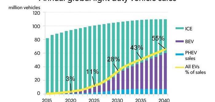 彭博新能源財經高級交通團隊研究總監Colin McKerracher,說:“在過去的一年里,汽車公司推出了越來越多的新能源汽車產品,政府頒布了新的污染控制政策,這促使我們對新能源汽車的未來發展更加樂觀。與2017年相比,今年的乘用車預測結果略有調整。我們預測2040年,占輕型汽車(乘用車和皮卡)市場新車銷量的55%,略高于去年預測的54%。到那時,新能源乘用車在全球輕型汽車保有量中的比例將達到33%。”“今年報告的最大亮點是對新能源公交車市場的預測。中國在新能源客車市場的領先優勢非常明顯,去年占據了全球99%的市場份額。其他市場也將跟上這一趨勢。到2040年,我們預計全球80%的城市公交車將是新能源汽車。“彭博新能源財經認為,交通部門的變化將對電力需求和石油市場產生深遠影響。到2040年,全球新能源乘用車和公交車每年將消耗2萬億千瓦時的電力,相當于全球電力消耗的6%將使全球每日燃料需求減少730萬桶。彭博社的新能源金融團隊仔細討論了新能源汽車的發展是否會導致鋰和鈷等關鍵金屬的短缺。高級運輸團隊的高級分析師Salim Morsy,他表示:“盡管我們對新能源汽車的未來發展持樂觀態度,但我們認為兩個障礙正在逐漸顯現。短期內,我們認為2020年后鈷供應短缺將減緩近年來鋰電池成本的快速下降。從長遠來看,充電基礎設施仍然是一個挑戰。”。“新能源汽車的未來銷量將受到兩個因素的影響:主要汽車市場充電基礎設施的部署速度和“共享出行”的發展速度。彭博新能源財經智能出行團隊研究總監Ali Izadi Najafabadi表示:“我們相信,全球共享出行汽車將從現在的500萬輛增加到20輛百萬……
