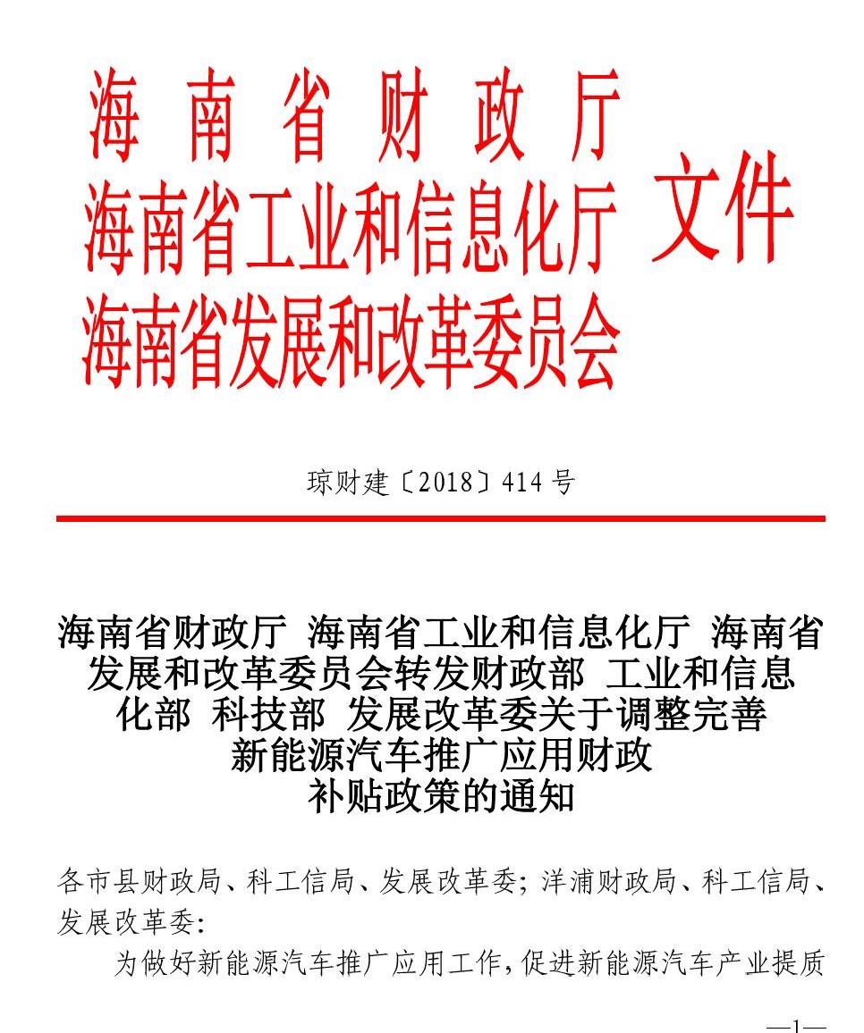 補貼按照《關于調整完善新能源汽車推廣應用財政補貼政策的通知》(財建〔2018〕18號)標準執行。如有其他問題,請聯系65342974或市、縣工業和信息化局(聯系方式見附件)。附件:各市縣工業和信息化局聯系方式。doc《財政部發展改革委、工業和信息化部、科技部關于調整完善新能源汽車推廣應用財政補貼政策的通知》(財建〔2018〕18號).pdf近日,海南省轉發了四部委《關于調整完善新能源汽車推廣應用財政補貼政策的通知》。2018年,地方財政購買新能源汽車補貼標準繼續按照中央政府同期1:0.5補貼標準執行。其中,省、市、縣財政各承擔50%。市縣要加快充電基礎設施建設,地方購買新能源汽車補貼資金將按照中央政策要求逐步劃轉,用于支持充電基礎設施的建設運營、新能源汽車的使用運營等環節。