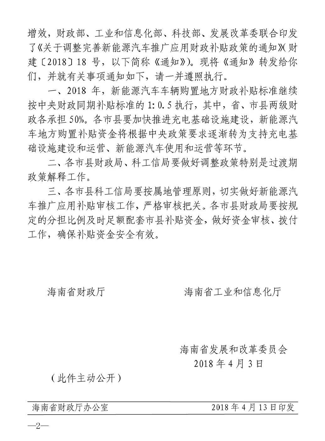 在工業和信息技術部的門戶網站上查看。(http://xxgk.hainan.gov.cn/hi/hi0105/201806/t20180601_ 2647555.htm或搜索海南省工業和信息化廳網站的“高新技術產業”欄)七。2018年新能源汽車補貼情況詳細說明。2018年,新能源汽車補貼按照上牌時間分三個階段計算。(1) 2018年1月1日至2018年2月11日期間上牌的新能源汽車,其車型需進入《2017年新能源汽車推廣應用推薦車型目錄》或2018年第一至第四批《新能源汽車宣傳應用推薦車型名錄》;補貼按照《科技部發展改革委、財政部工業和信息化部關于調整新能源汽車推廣應用財政補貼政策的通知》(財建〔2016〕958號)標準執行2018年2月12日至2018年6月11日,其車型需進入《2017年新能源汽車推廣應用推薦車型目錄》或2018年第一至第四批《新能源汽車宣傳應用推薦車型名錄》;新能源乘用車和新能源公交車補貼為《財政部工業和信息化部發展改革委關于調整新能源汽車推廣應用財政補貼政策的通知》(財建〔2016〕958號)相應標準的0.7倍,新能源卡車和特種車輛的補貼為0.4倍,而燃料電池汽車的補貼標準保持不變。(3) 2018年6月12日至2018年12月31日期間上牌的新能源汽車,其車型需進入2018年第五批及后續批次《新能源汽車推廣應用推薦車型目錄》;補貼按照《關于調整完善新能源汽車推廣應用財政補貼政策的通知》(財建〔2018〕18號)標準執行。如有其他問題,請聯系65342974或市、縣工業和信息化局(聯系方式見附件)。附件:各市縣工業和信息化局聯系方式。doc《財政部發展改革委、工業和信息化部、科技部關于調整完善新能源汽車推廣應用財政補貼政策的通知》(財建〔2018〕18號).pdf
