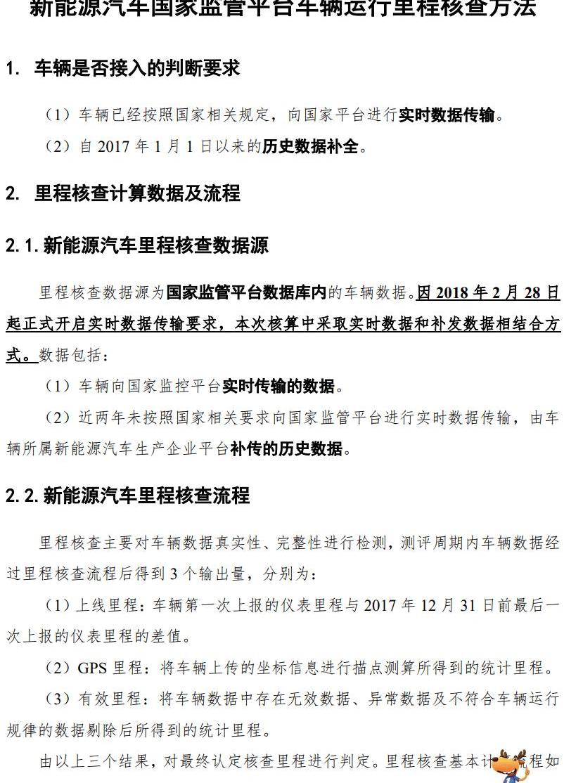 在5月25日,新能源汽車運營服務管理中心發布《關于<:國家新能源汽車監管平臺車輛運營里程核查辦法(2018)>的公告》(以下簡稱《公告》)。根據《通知》,根據國家新能源汽車監管平臺(2018)的車輛里程驗證方法,里程驗證主要測試車輛數據的真實性和完整性,評估期內車輛數據經過里程驗證過程后得到三個輸出,即:(1)在線里程:2017年12月31日前第一次報告的儀器里程與最后一次報告的儀表里程之差。(2) GPS里程:通過追蹤車輛上傳的坐標信息獲得的統計里程。(3) 有效里程:從車輛數據中排除無效數據、異常數據和不符合車輛運行規則的數據所獲得的統計里程。基于以上三個結果,判斷最終驗證里程。根據國家監管平臺的任務要求,自2017年10月以來,電動汽車國家工程實驗室(新能源汽車國家監測管理平臺)組織了多家車企與制造商的座談,并于2018年1月30日舉辦了國家監管平臺動態數據訪問和里程核算算法研討會,得到了多家新能源汽車公司的認可。經過反復的試算、驗證和優化,形成了《車輛行駛里程驗證方法(2018)》(以下簡稱“里程驗證方法”)。現在將公布里程驗證方法。2018年1月30日,國家監管平臺動態數據訪問與里程核算算法研討會召開,得到了多家新能源汽車公司的認可。經過反復的試算、驗證和優化,形成了《國家新能源汽車監管平臺車輛運行里程驗證辦法(2018)》。
