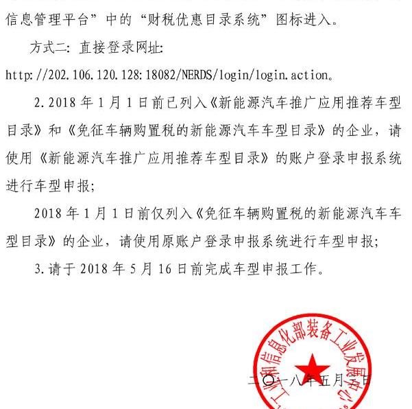 5月3日,工信部裝備產業發展中心發布《免征車輛購置稅新能源汽車目錄(第十八批)》申報通知,指出企業資質申報材料報送方式不變,需在5月11日前完成。1月1日前已列入《新能源汽車推廣應用推薦車輛目錄》和《免征車輛購置稅新能源汽車目錄》的企業,2018年將使用《新能源汽車推廣應用推薦車輛目錄》賬號登錄申報系統進行車輛申報。2018年1月1日前,只有列入《免征車輛購置稅新能源汽車目錄》的企業,才會使用原賬號登錄申報系統進行車輛申報。企業需要在5月16日前完成車型申報。