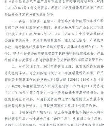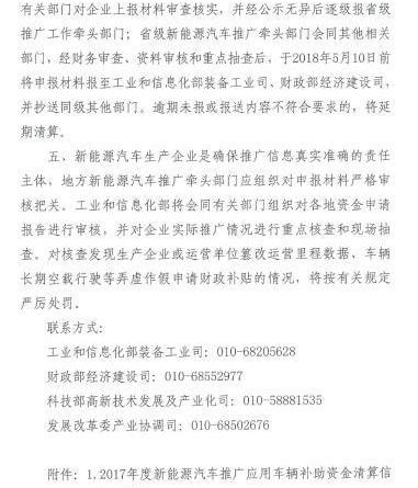 4月19日,財政部、工業和信息化部、科技部、國家發展改革委發布《關于啟動2017年及以前年度新能源汽車資金結算推廣應用補貼申請的通知》,其中明確規定,2017年1月1日至12月31日,各級領導部門應向地方汽車生產企業提交中央財政補貼資金結算申請報告。對于2015年和2016年銷售但未獲得補貼的車輛,執行相應的年度補貼標準。除私人購買新能源乘用車、工作專用車、黨政機關公務用車和民航機場車輛外,其他類型的新能源汽車必須達到2萬公里(截至2017年12月31日)才能獲得補貼。