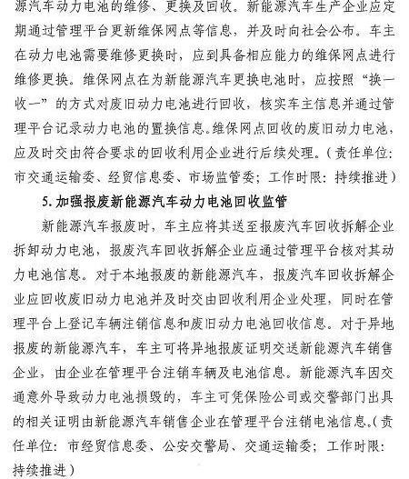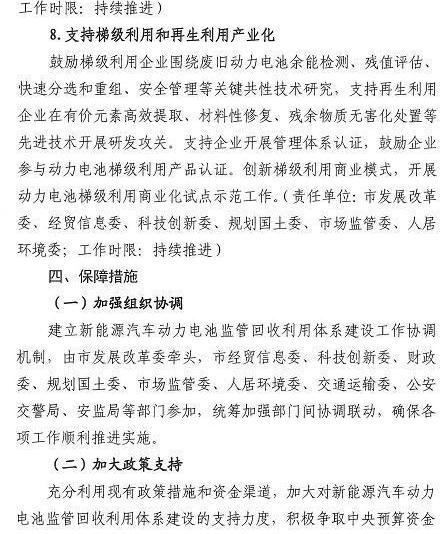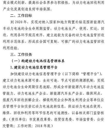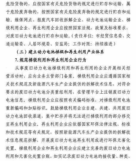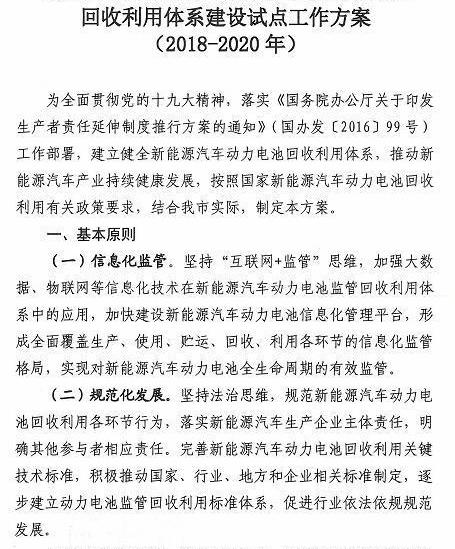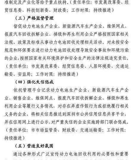 維修網點管理,加強報廢新能源汽車動力電池回收監管,嚴格廢舊動力電池儲運管理,規范企業梯級利用回收行為,支持梯級利用回收產業化。深圳市發展和改革委員會印發了《深圳市國家新能源汽車動力電池監管回收體系建設試點工作方案(2018-2020年)》。為貫徹落實《國務院辦公廳關于印發生產者責任延伸制實施方案的通知》(國辦發〔2016〕99號),在我委環保廳的指導下,深圳市發展改革委深入研究,積極協調。今年3月,率先印發《深圳市國家新能源汽車動力電池監管回收體系建設試點工作方案(2018-2020年)》,在全市范圍內開展動力電池生產者延伸責任制的探索和實踐。在總結深圳試點經驗的基礎上,我委將不斷完善生產者責任延伸制度設計,力爭盡快出臺全國性的制度實施方案。現,深圳市發展和改革委員會發布的《深圳市國家新能源汽車動力電池監管回收體系建設試點工作方案(2018-2020年)》公開。附件:深圳市新能源汽車動力電池國家監管回收體系建設試點工作計劃(2018-2020年).pdf國家發展改革委環境保護司2018年4月2日