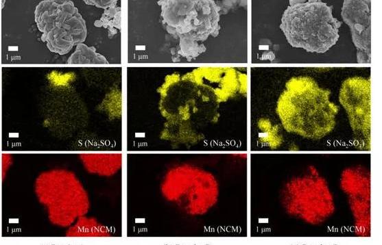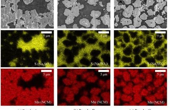NCM的表面。從EDX分析結果還可以看出,在三種粉末樣品中,C粉末中的硫酸鈉緊緊包裹在NCM表面,這也驗證了這種混合方法的可行性。