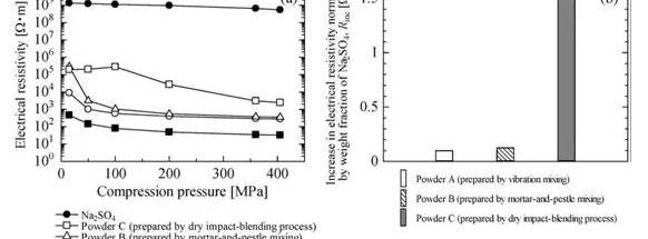 圖6。截面FESEM和EDX圖像的粉末c顆粒通過上述分析結果,提出了活性物質干涂層的模型:首先,研磨后,板載顆粒硫酸鈉粘附在主體顆粒NCM111上。經過沖擊、摩擦和混合后,板材顆粒會發生塑性變形和聚集,在這個過程中NCM的結構不會受到破壞。這主要是由兩種研磨的財產的差異決定的。硫酸鈉的韌性和延展性正好適合于涂覆堅硬和脆性的生命物質顆粒。B、本文開頭的電阻系數比較,介紹了電解質和生物顆粒的財產。電解質是不導電的,而生物是導電的。這意味著,活性物質顆粒被硫酸鈉顆粒包裹得越好,顆粒的電阻率就越大。將粉末A、B和C在360Mpa的壓力下壓制成片狀,并分析了阻力系數。具體分析結果如圖7所示。