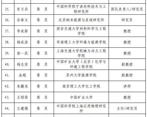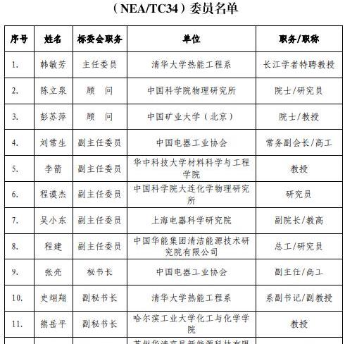 能源行業中的高溫燃料電池,編號為NEA/TC34。標準委員會的秘書處將由你擔任。2.同意第一屆能源行業高溫燃料電池標準化技術委員會由43名成員組成,另有2名顧問(名單見附件),韓敏芳為主任委員,劉長勝、李健、程默杰、吳曉東、程健為副主任委員,肖恩為秘書長。三、 同意能源行業高溫燃料電池標準化技術委員會主要負責固體氧化物燃料電池和熔融碳酸鹽燃料電池在技術和工業領域的標準化工作。四、 同意您負責能源行業高溫燃料電池標準化技術委員會的日常管理工作,并指導標準的制定和批準。請按照《國家能源局關于印發<:能源領域行業標準化管理辦法(試行)>及通知實施細則》(國家能源局科技[2009]52號)的相關管理要求執行。附件:2018年1月24日國家能源局第一屆能源行業高溫燃料電池標準化技術委員會(NEA/TC34)成員名單