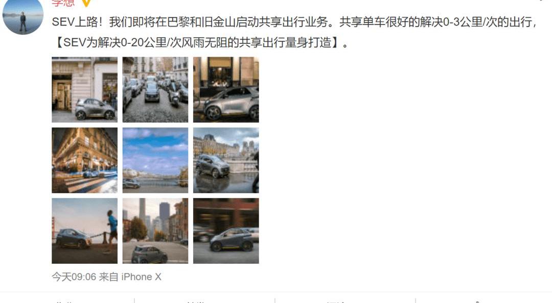 現在,隨著SEV照片首次公開,巴黎和舊金山的汽車與家庭共享旅行服務也將啟動。李想微博表示,“SEV是為解決0-20公里/次、風雨無阻的問題而量身定制的”。