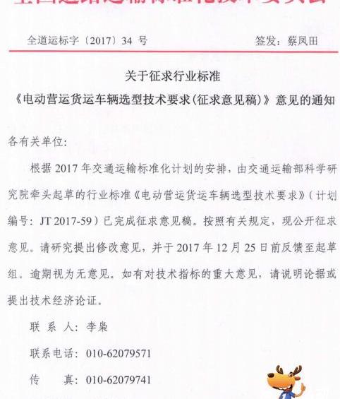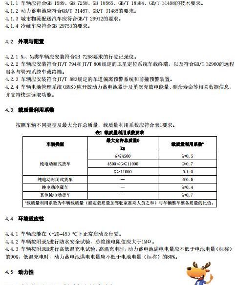 日前,全國道路運輸標準化技術委員會發布《電動貨車選型技術要求(征求意見稿)》,并公開征求意見。根據意見稿,根據電動貨車的實際需求和貨車制造商的技術水平,該標準的范圍,即標準電動貨車的選擇要求和試驗方法,適用于純電動N1,N2和N3運行的貨車由電機驅動,其驅動力來自車載可再充電儲能系統(REESS),但不適用于燃料電池汽車。在對載質量利用系數的要求方面,意見稿根據不同車型和最大允許總質量,以30%左右的淘汰率為原則,提出了相應車輛載質量利用率的要求。在環境適應性方面,電動卡車的高低溫適應性應滿足車輛在(-20~45℃)下能夠正常啟動和運行的要求;