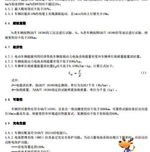 為保證貨運電動汽車在高溫、低溫下的正常充電,該標準對車輛的高低溫充電性能提出了要求,并明確了高溫、低溫充電性能的測試方法。在高溫充電時,動力電池的滿充電容量不應小于電池容量(標稱)的90%,在低溫充電時,電動電池的滿充容量不應低于電池容量(額定)的80%。在涉水適應性方面,意見稿提出,在最大工作電壓下,直流電路的最小絕緣電阻應至少大于100Ω/V,交流電路的最小隔離電阻應至少小于500Ω/V。根據B級電壓的最高值,并考慮到設計裕度,總絕緣電阻設置為1MΩ。針對動態性能,標準意見稿提出,根據電動貨車的運行條件,按照GB/T 18385規定的試驗方法測得的30min最大速度不應小于80km/h。對于加速性能,標準意見稿根據不同總質量段的車輛提出了不同的加速時間要求:總質量小于4500 kg的車輛,(0~50)km/h和(50~80)km/h的加速時間分別不應超過10s和15s;總質量不小于4500kg的車輛,(0~50)km/h和(50~80)km/h的加速時間分別不應超過15s和20s。此外,對于最大爬坡程度,標準意見稿提出了最大爬坡程度不得低于20%的要求。目前,純電動貨運車主要應用于城市物流配送領域。日均里程需求一般在150~180公里左右,200公里的續航里程可以滿足大多數運輸企業的運營需求。因此,標準意見稿對貨運電動汽車的續航里程提出了要求。N1類車輛按GB/T 18386的工況法進行試驗,N2、N3類車輛按GB/T18386的等速法試驗,行駛里程應不小于200km。貨運電動汽車的經濟水平不僅可以反映車輛的耗電水平,還可以反映卡車本身的載貨能力。因此,為了提高貨運電動汽車的經濟性,在補貼政策的基礎上,標準草案將動力電池系統的質量能量密度和單位負荷能耗分別收緊至95瓦時/公斤和0.45瓦時/公里公斤。