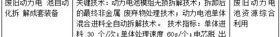 11月14日,工業和信息化部就《國家鼓勵的重大環保技術和設備目錄(2017年版)》(征求意見稿)公開征求意見。征求意見稿涉及140項重大環保技術和設備。其中,選用了適用于廢舊動力電池資源綜合利用的廢舊動力電池自動拆解成套設備。廢舊動力電池自動拆解成套設備關鍵技術:動力電池組件無損拆解技術;拆解后的最終非金屬廢物處理技術;動力電池單體混合進料全自動拆卸技術。技術指標:單體進料30次;單體加工速度為60s/件;電池芯的彈出率高于百分之九十七的彈出率。
