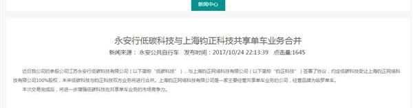 昨晚,江蘇永安行官方宣布與哈羅單車簽署協議,雙方業務將合并。這也是共享單車領域的首次合并。公告稱:永安興低碳科技有限公司有限公司與上海駿正網絡科技有限公司有限公司簽署了企業合并協議。低碳科技收購君正科技100%股權后,雙方業務將合并。有限公司是一家主要從事自行車共享業務的公司,其品牌為Hello Bicycle。永安興表示,本次交易的完成將進一步提升共享單車低碳科技業務的市場競爭力。數據顯示,永安興低碳科技今年9月獲得螞蟻金服等機構8.1億元融資。第一大股東是永安興,第二大股東是螞蟻金服。永安銀行于8月17日正式上市,也是共享單車第一股。