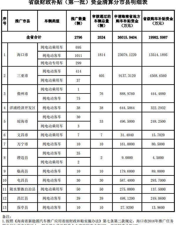 10月23日,海南省公布了《2016年海南省新能源汽車推廣應用省級財政補貼資金落戶清單(第一批)》。海南省各市縣累計推廣車輛2796輛,批準車輛總數2524輛,計劃撥款199825987元。