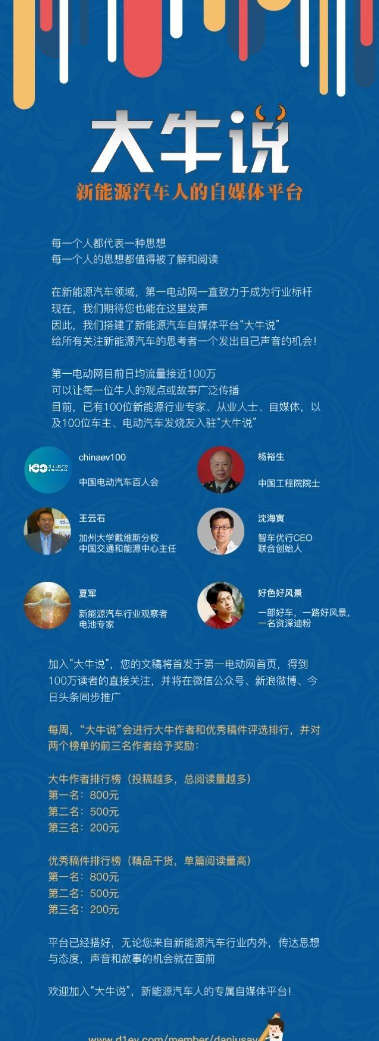 第一電動網10月21日27日一周大牛說榜單揭曉,踴躍投稿的大牛作者們,感謝大家的積極參與,分享給我們精彩的觀點與故事,歡迎更多的新能源汽車圈內圈外的朋友加入大牛說,發表你的見解和體驗。