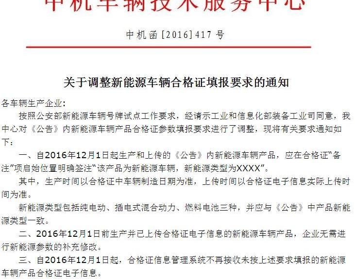 11月18日,中國機械中心發布《關于調整新能源汽車證書填報要求的通知》,規定自12月1日起生產上傳的新能源汽車產品,2016年應在證書“備注”項目的開頭清楚地標明“本產品為新能源汽車,新能源車型為XXXX”。